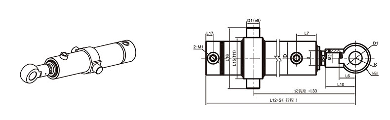 活塞桿端為外螺紋桿頭耳環(huán)連接