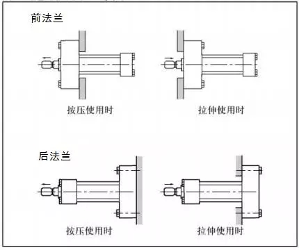 ?。?)法蘭安裝適合于液壓缸工作過程中固定式安裝,其作用力與支承中心處于同一軸線的工況;其安裝方式選擇位置有端部、中部或尾部三種,如何選擇取決作用于負載的主要作用力對活塞桿造成壓縮(推)應力、還是拉伸(拉)應力,一般壓縮(推)應力采用尾部、中部法蘭安裝,拉伸(拉)應力采用端部、中部法蘭安裝,確定采用端部、中部或尾部法蘭安裝需同時結(jié)合系統(tǒng)總體結(jié)構(gòu)設計要求和長行程壓縮(推)力工況的液壓缸彎曲穩(wěn)定性確定。